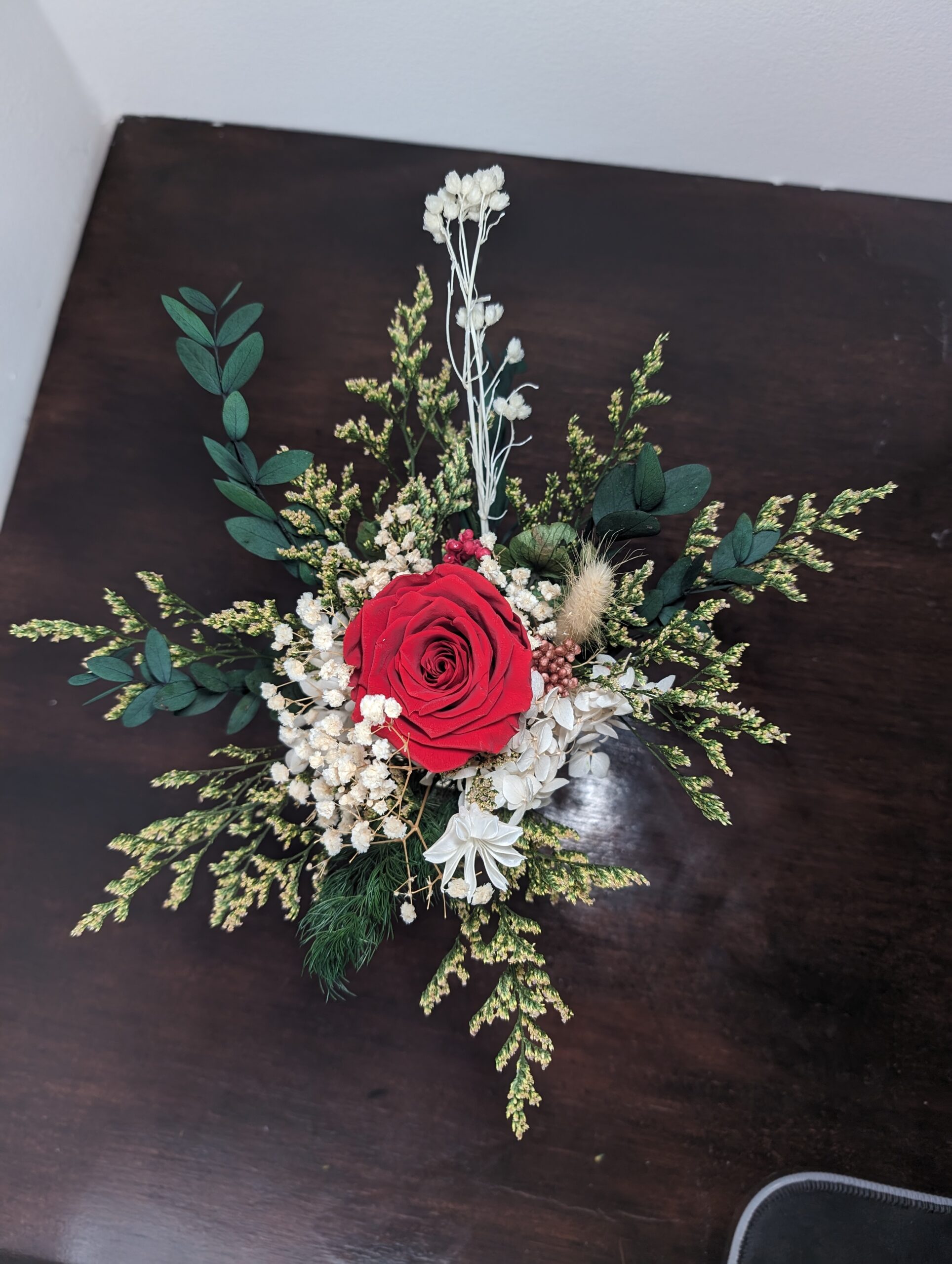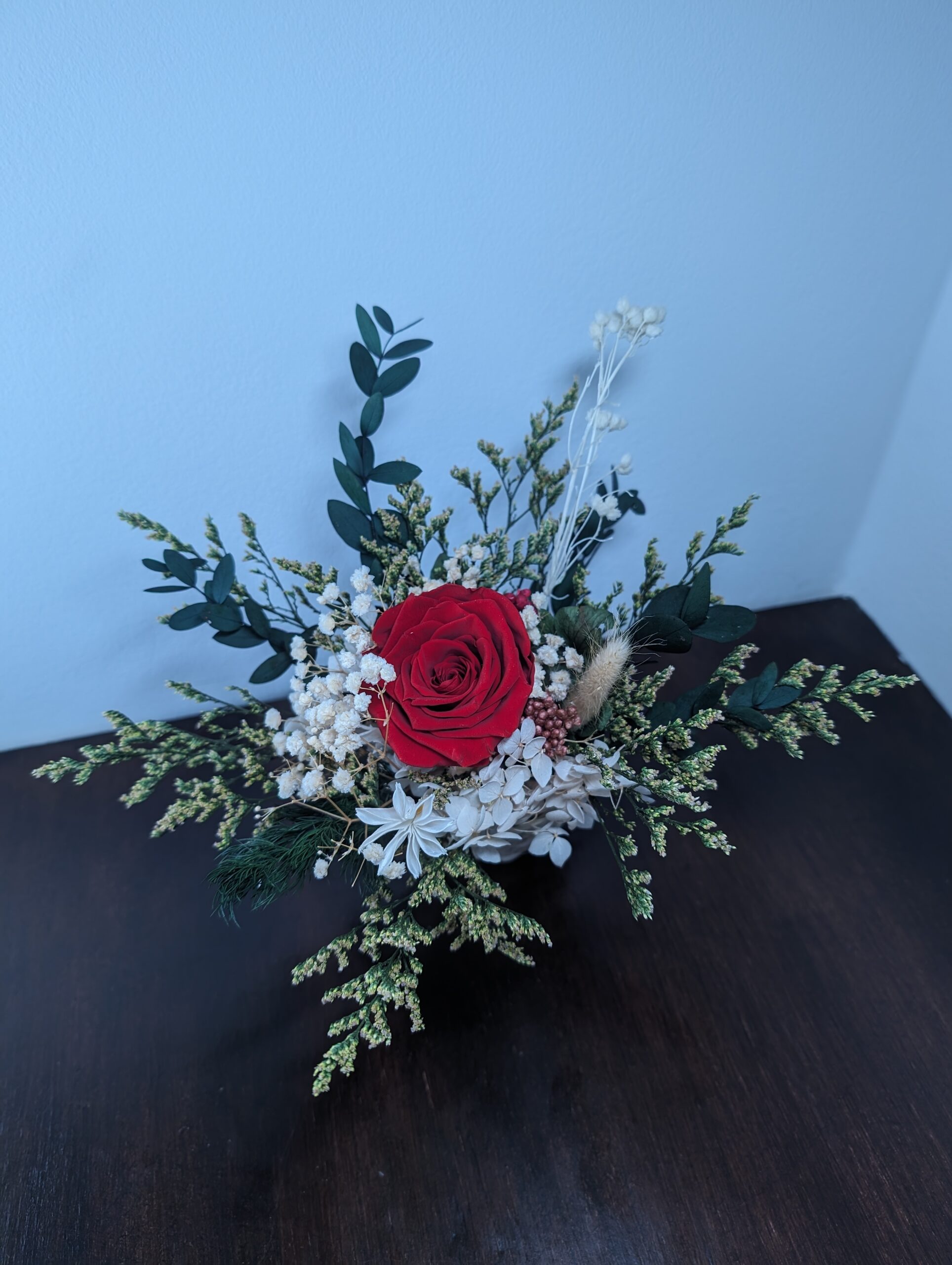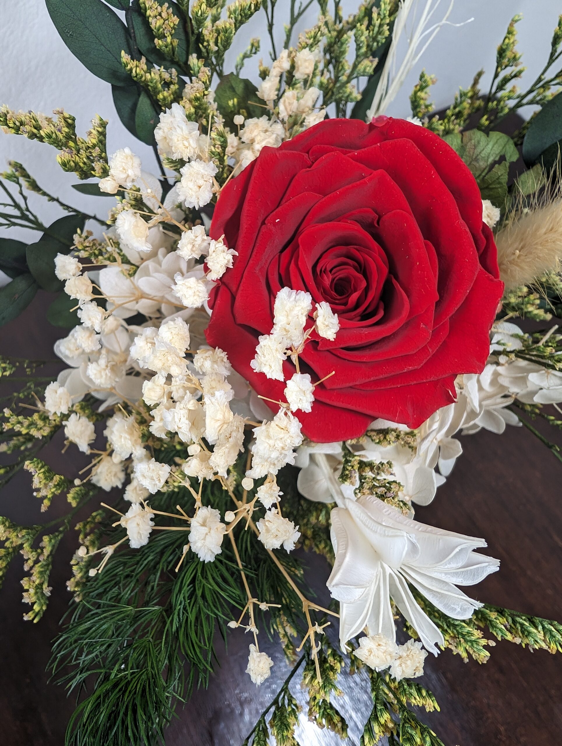Within this bouquet, discover a harmonious blend of stabilised flowers and dried blooms.