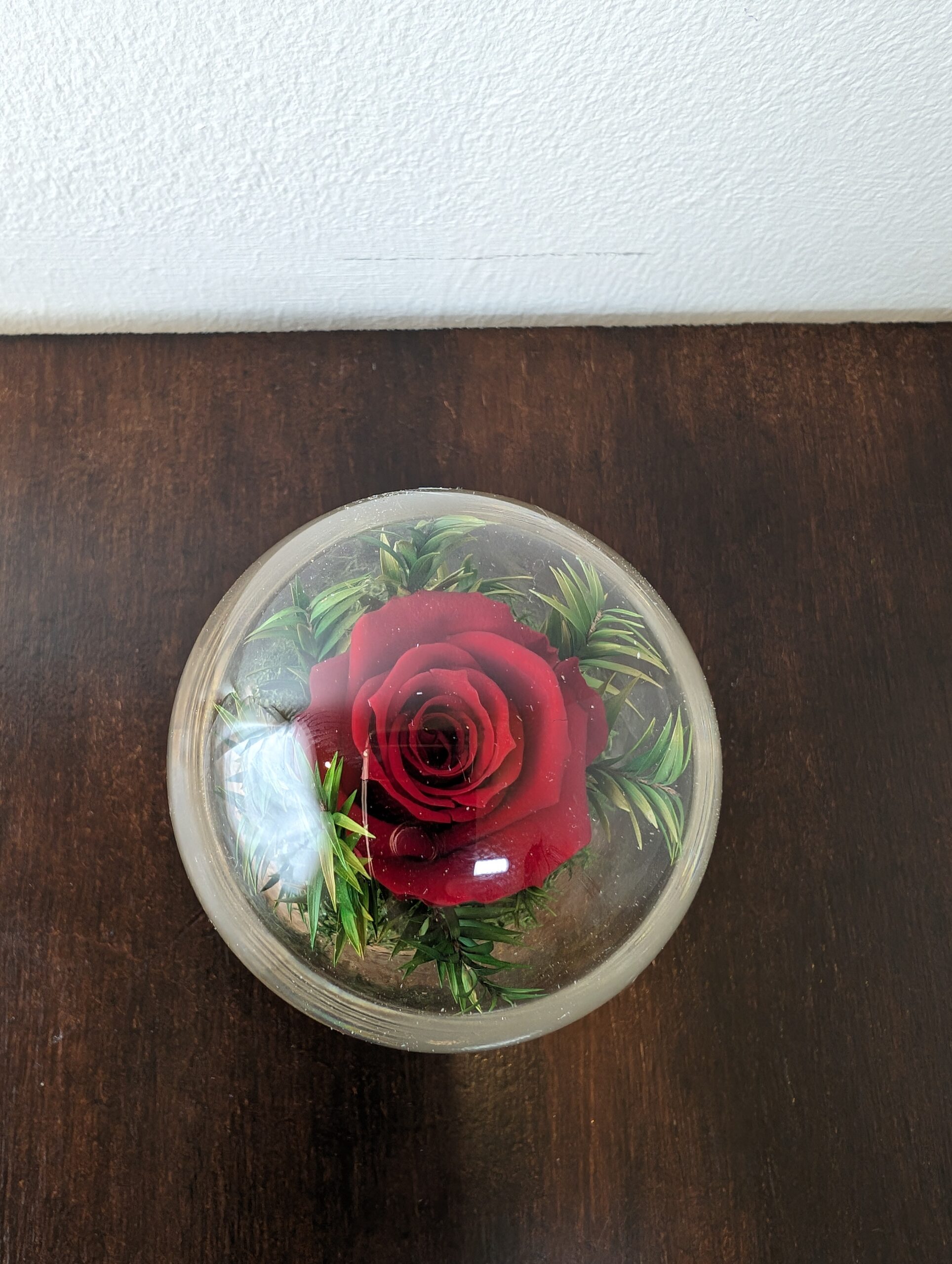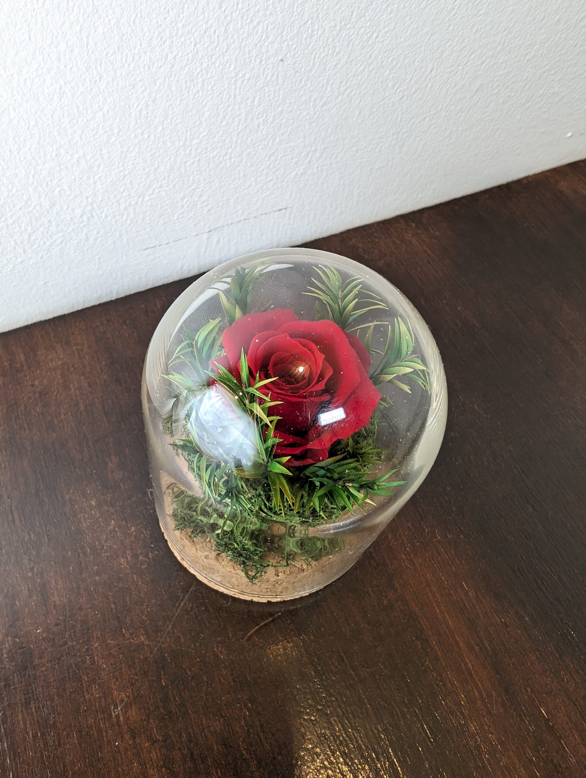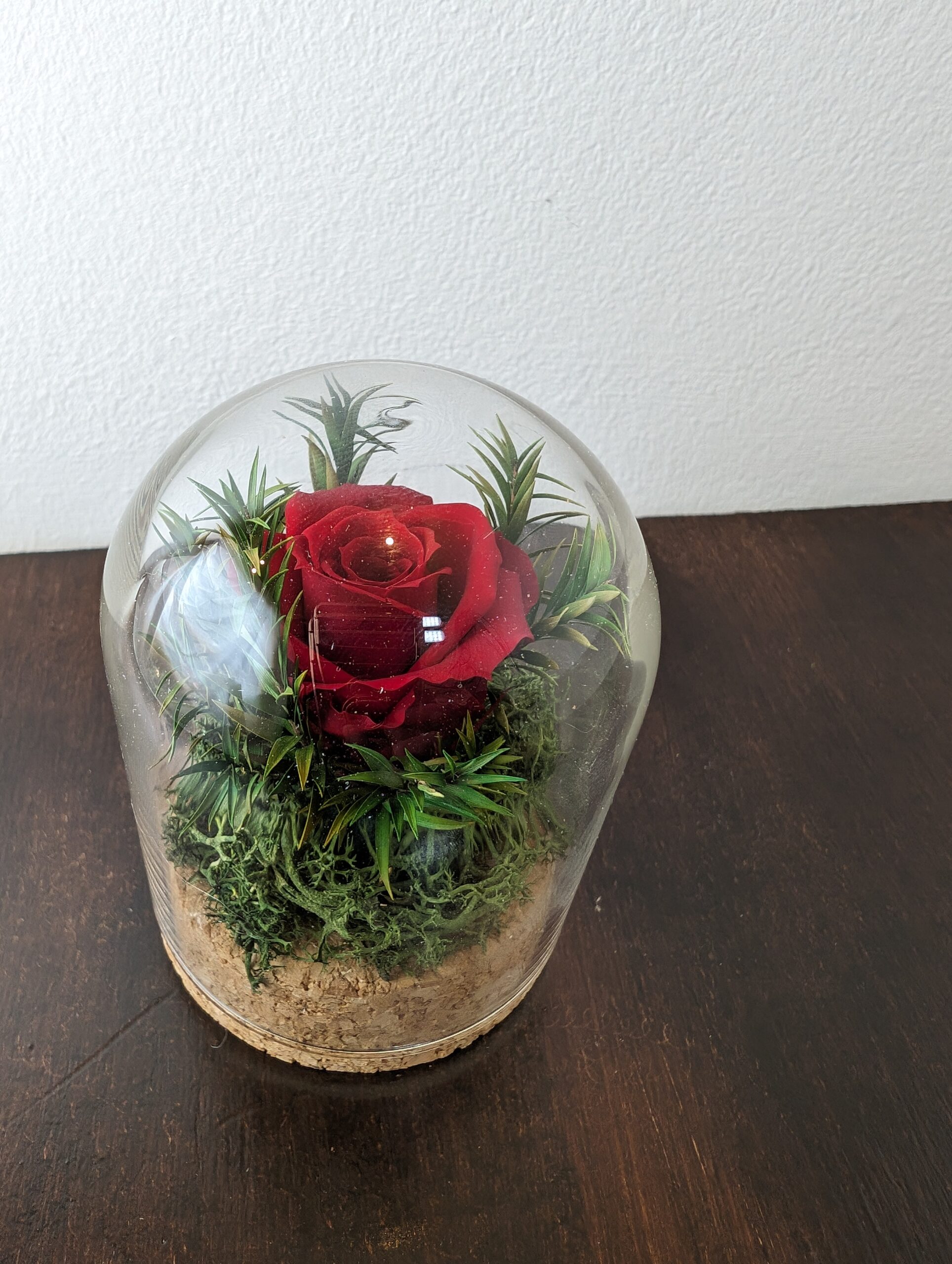 Discover the enchantment of our Elegant Stabilised composition now beautifully encased in a delicate glass ball, creating a captivating centerpiece for your table.