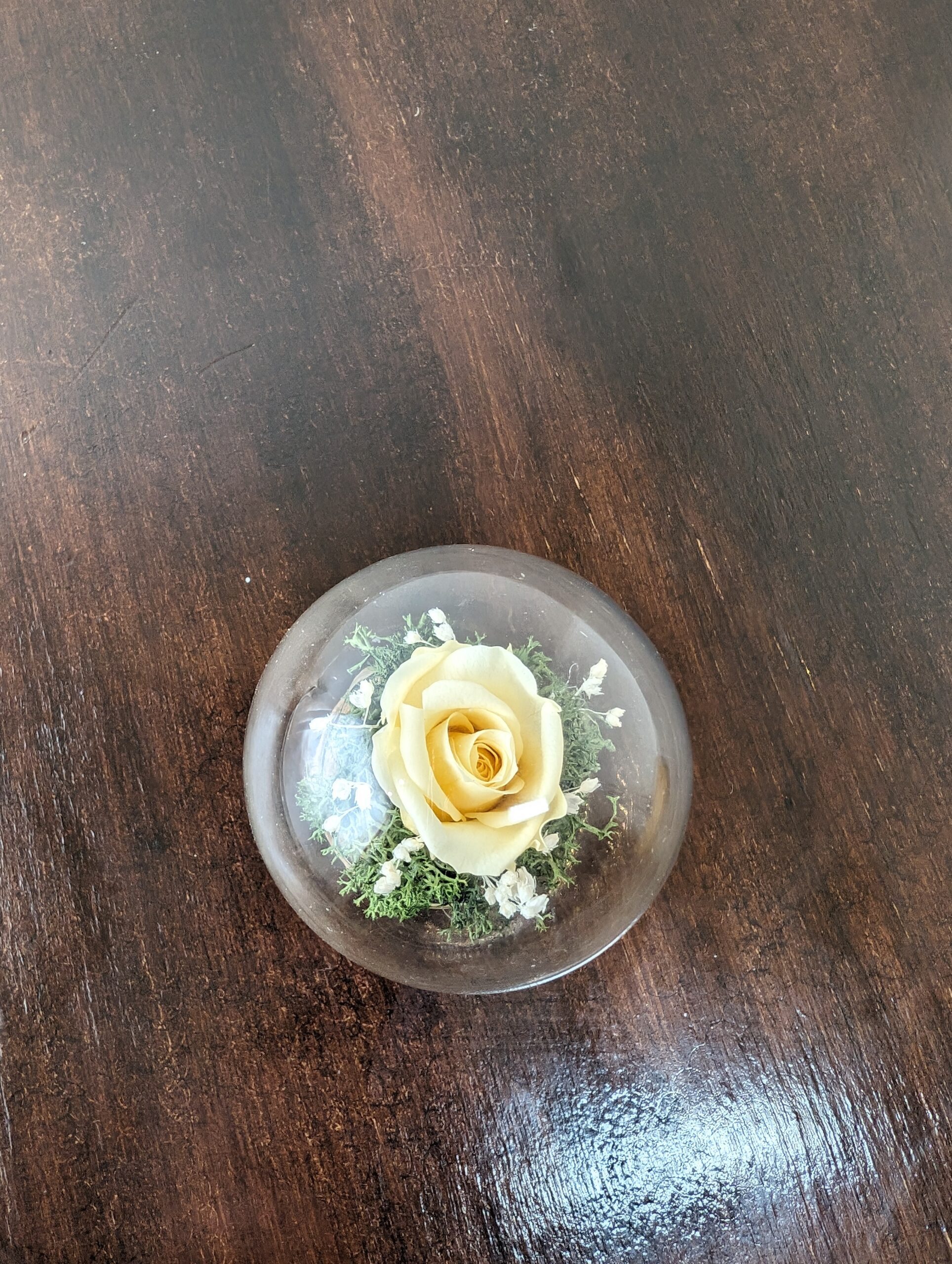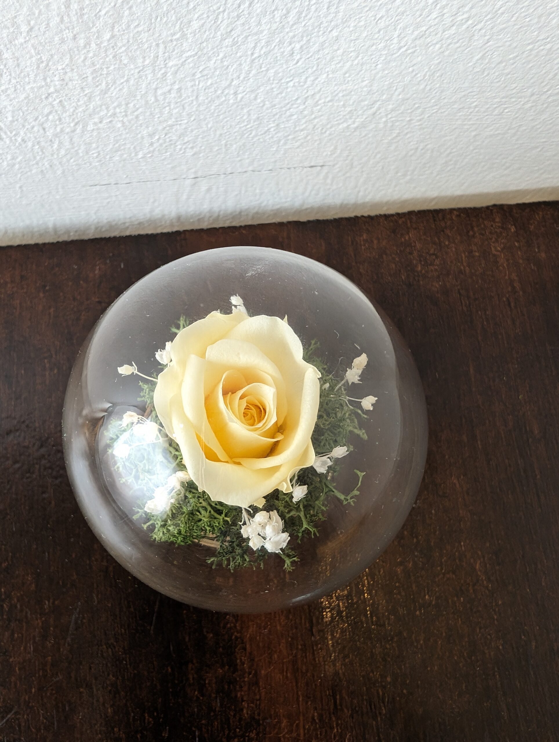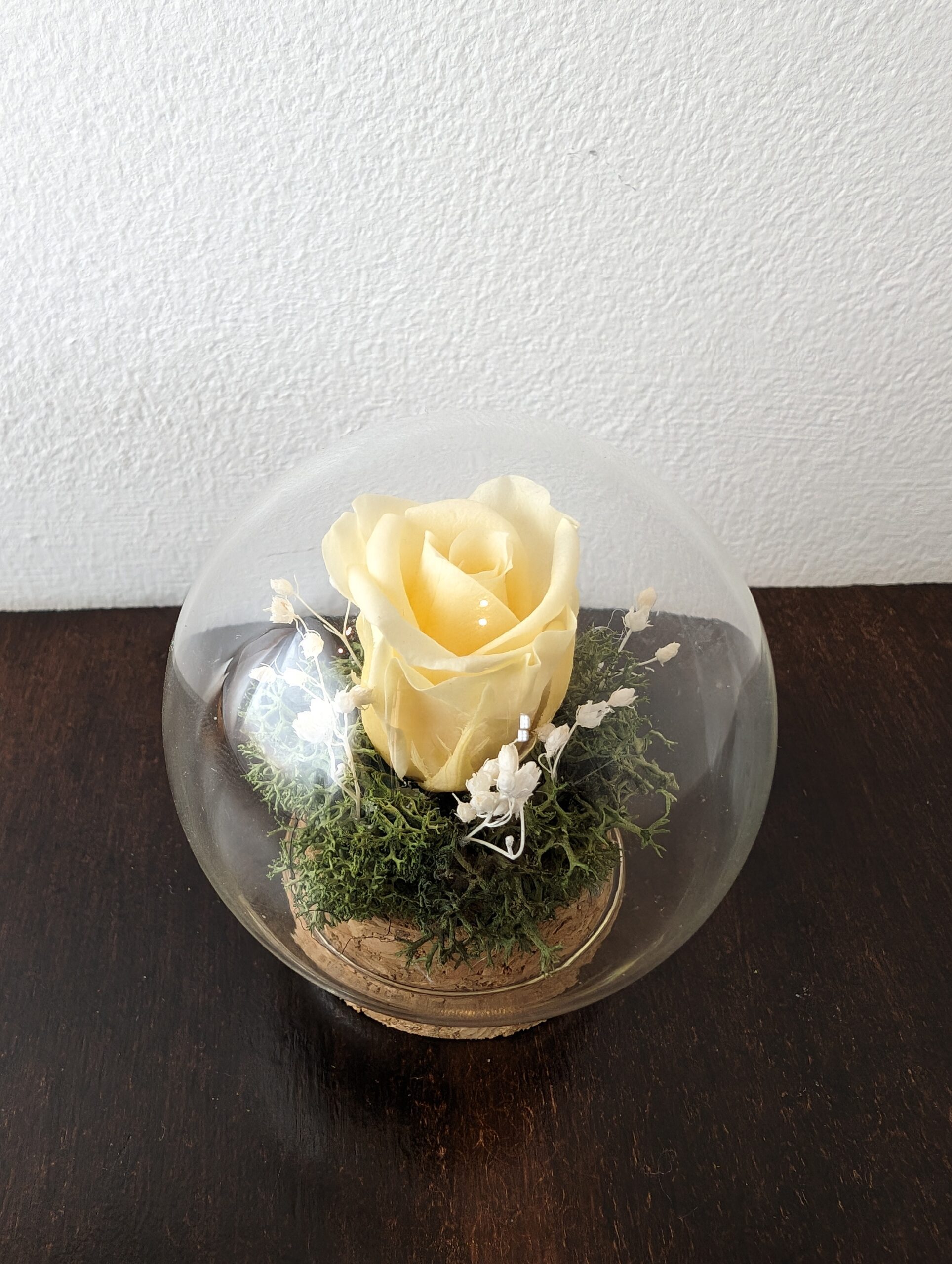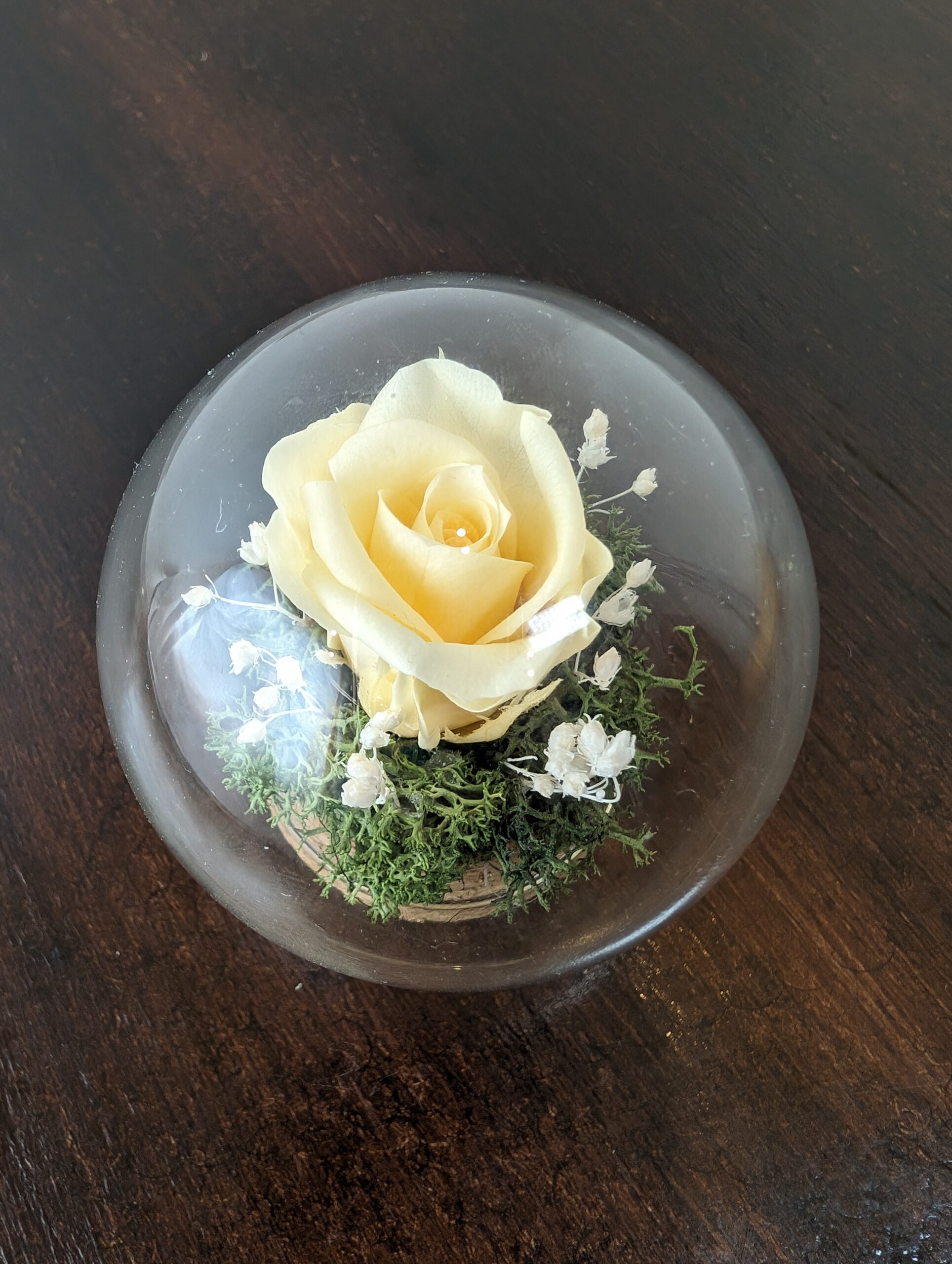 Discover the enchantment of our Elegant Stabilised composition now beautifully encased in a delicate glass ball, creating a captivating centerpiece for your table.