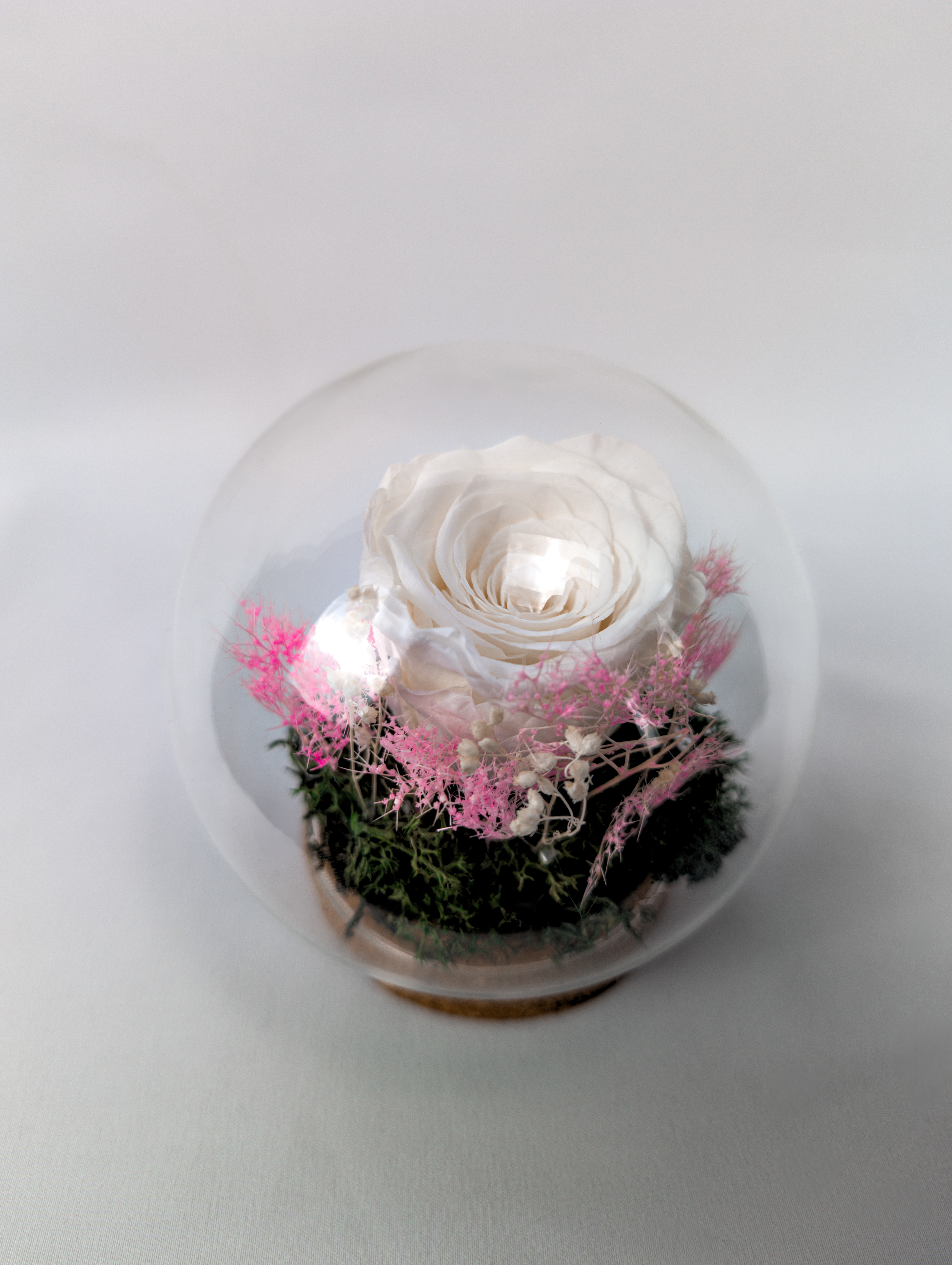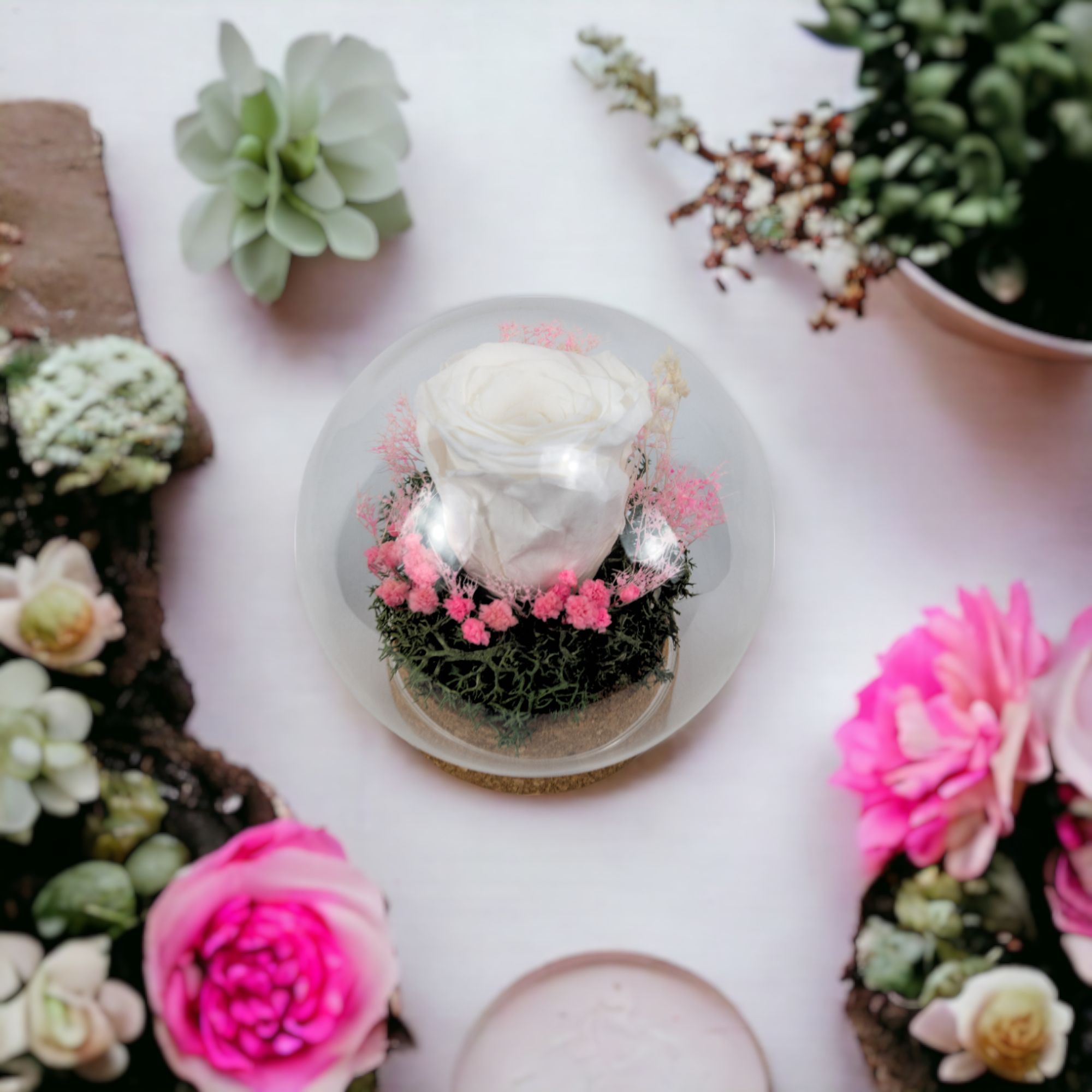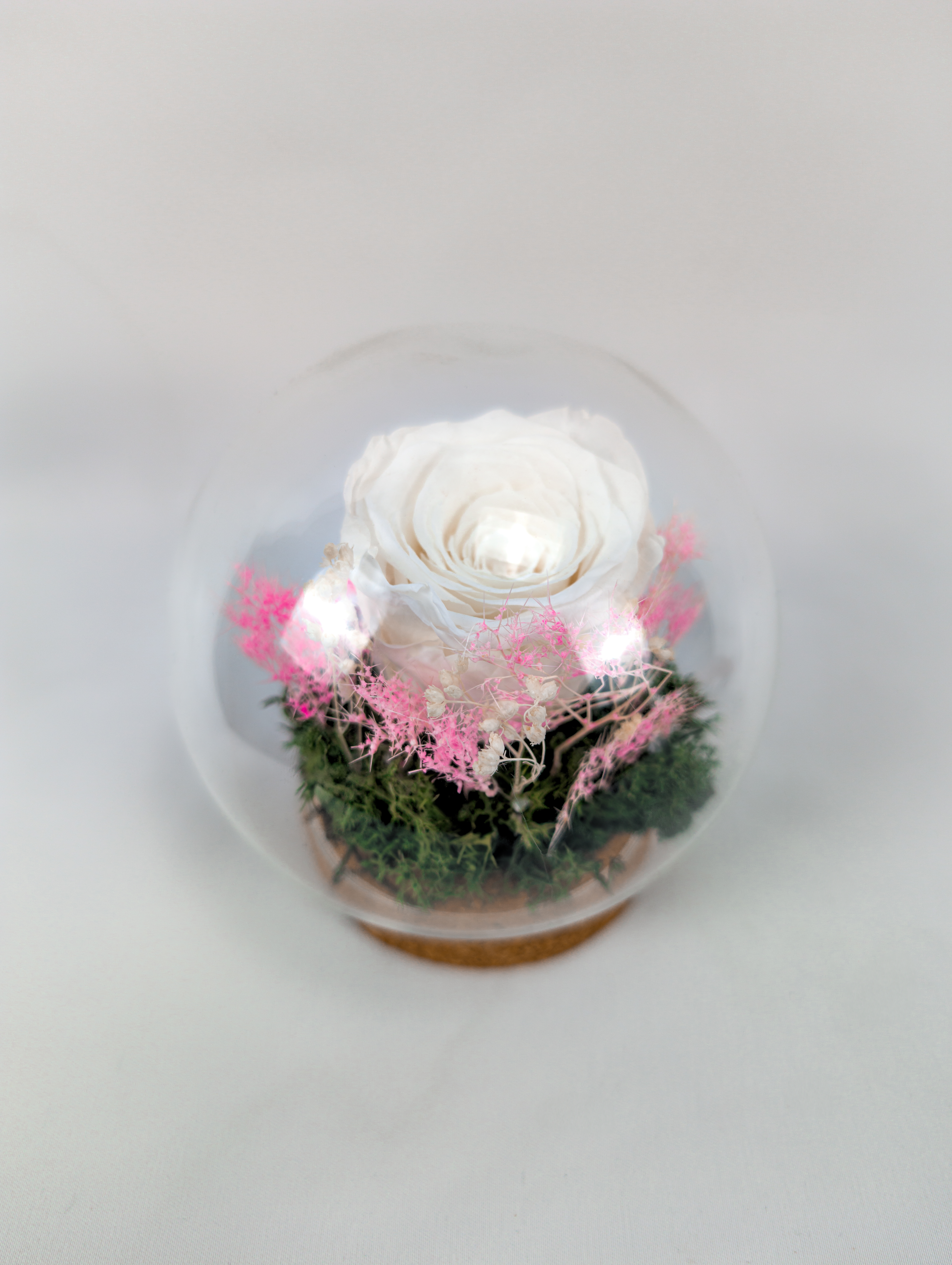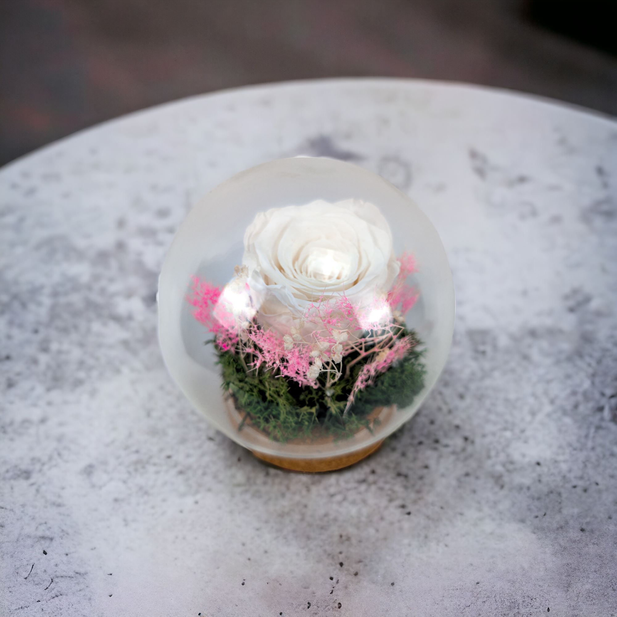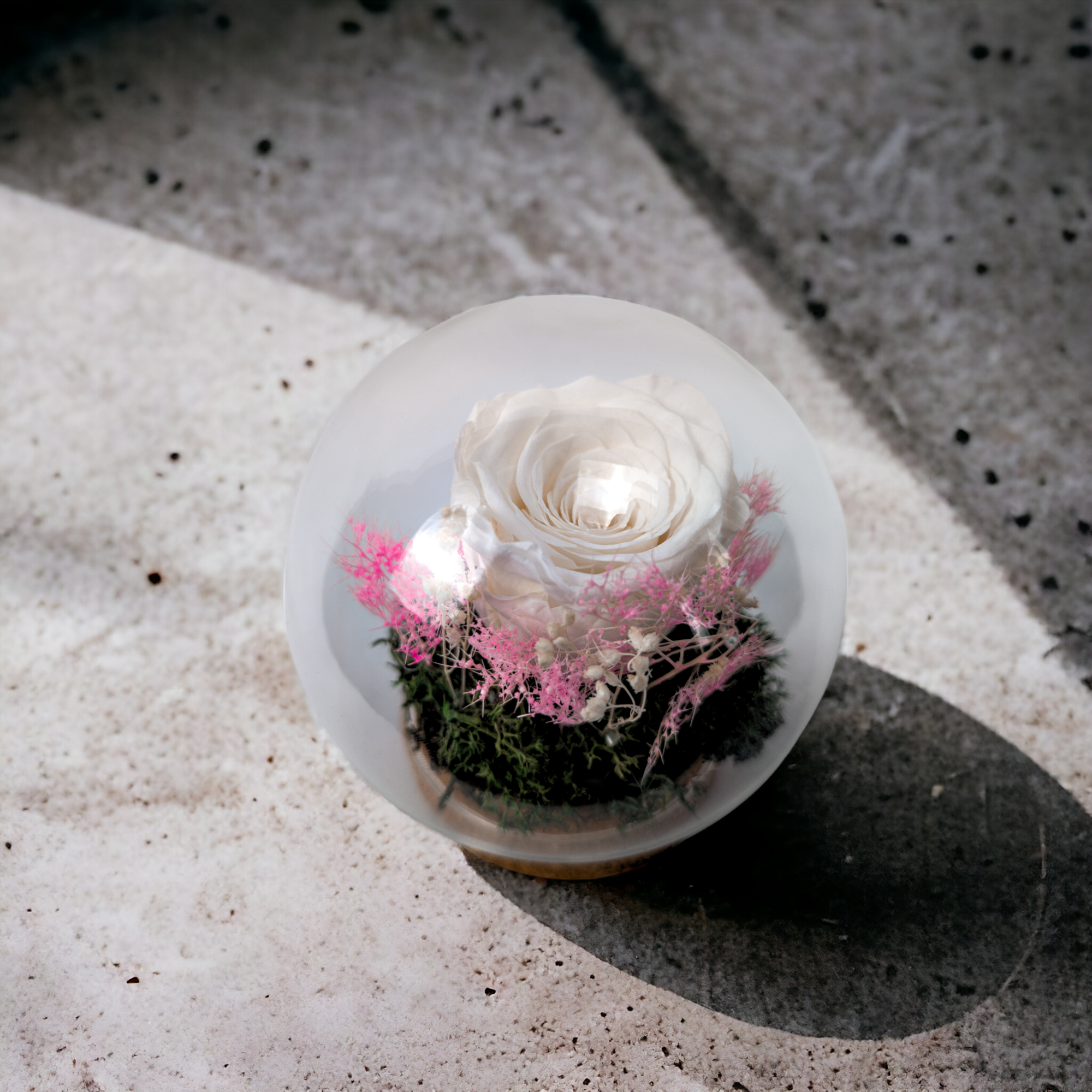 Discover the enchantment of our Elegant Stabilised Flowers now beautifully encased in a delicate glass ball, creating a captivating centrepiece for your table.
