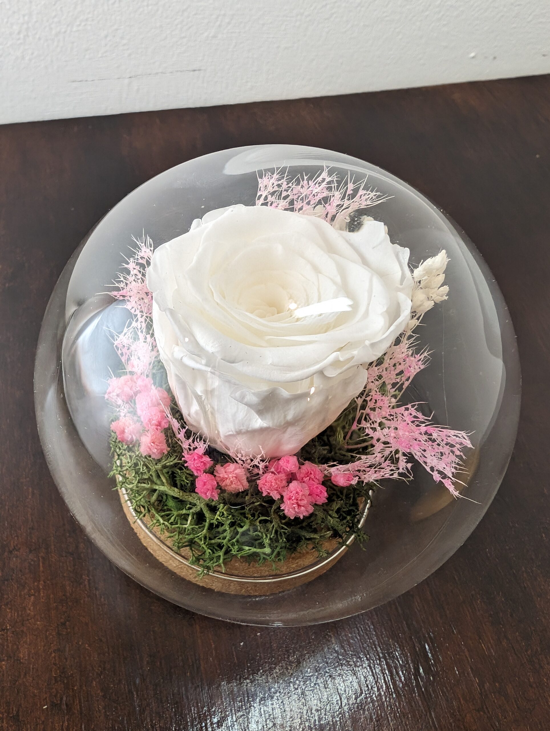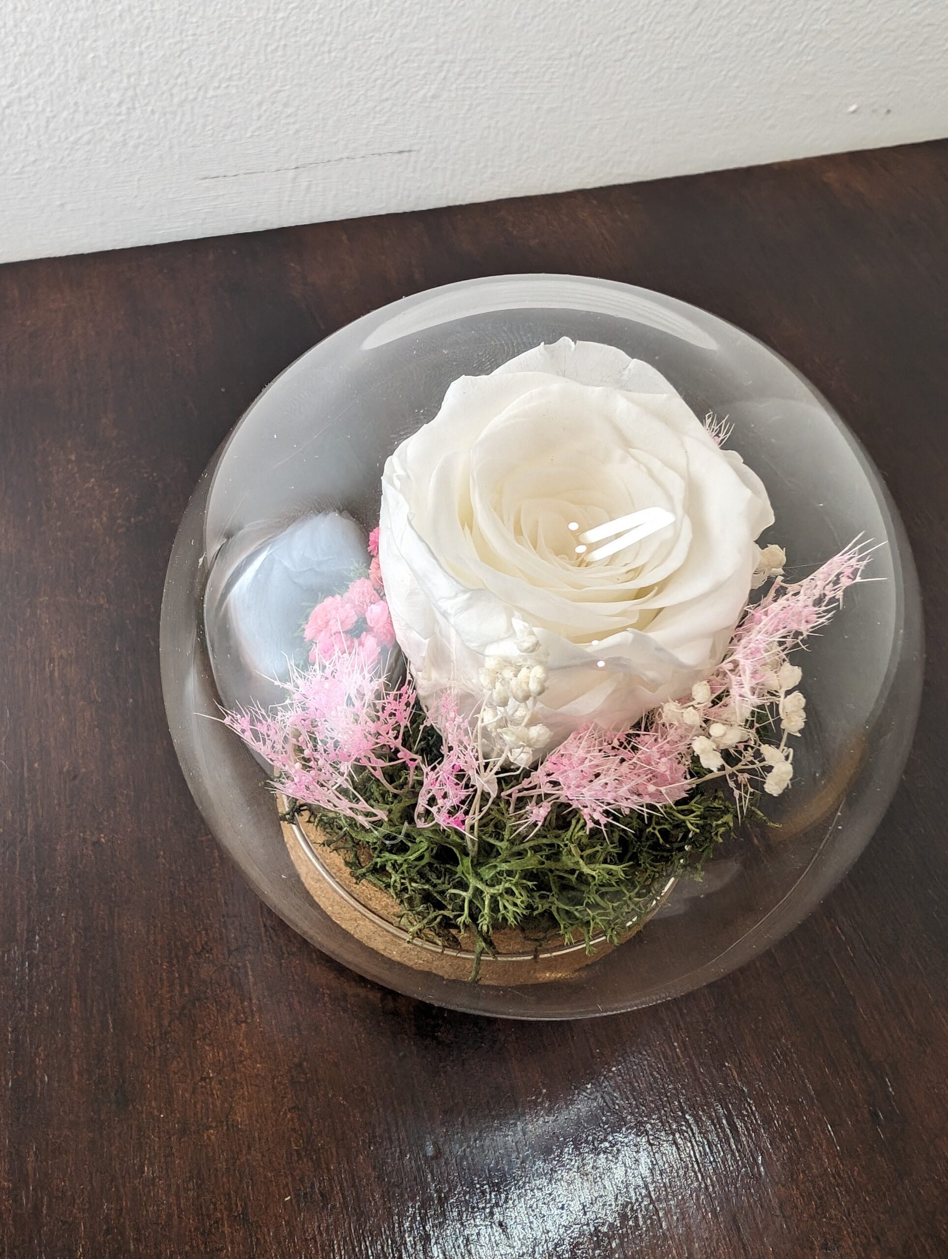 Discover the enchantment of our Elegant Stabilised composition now beautifully encased in a delicate glass ball, creating a captivating centerpiece for your table.